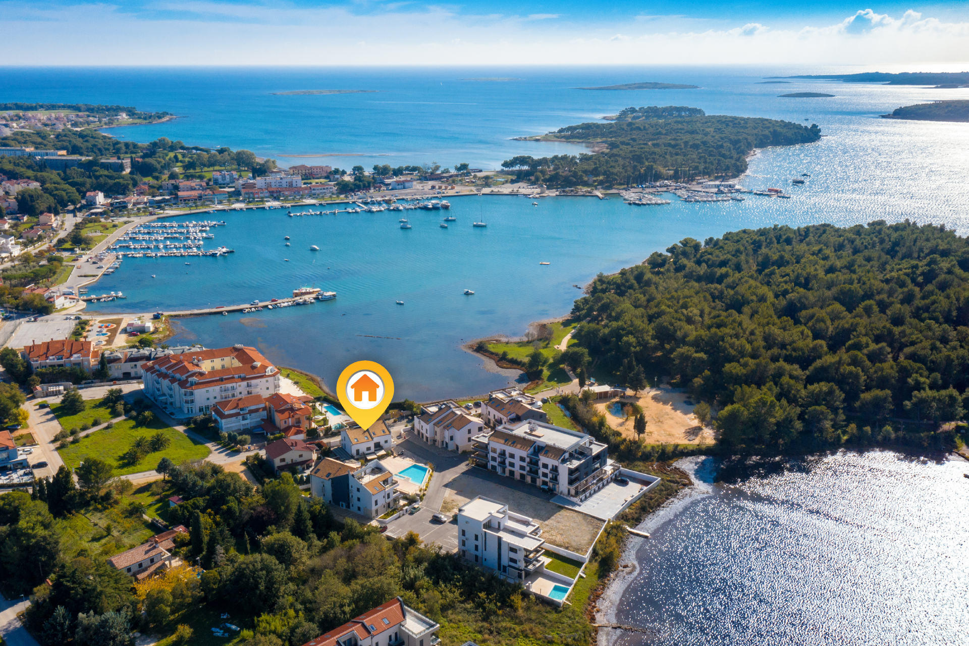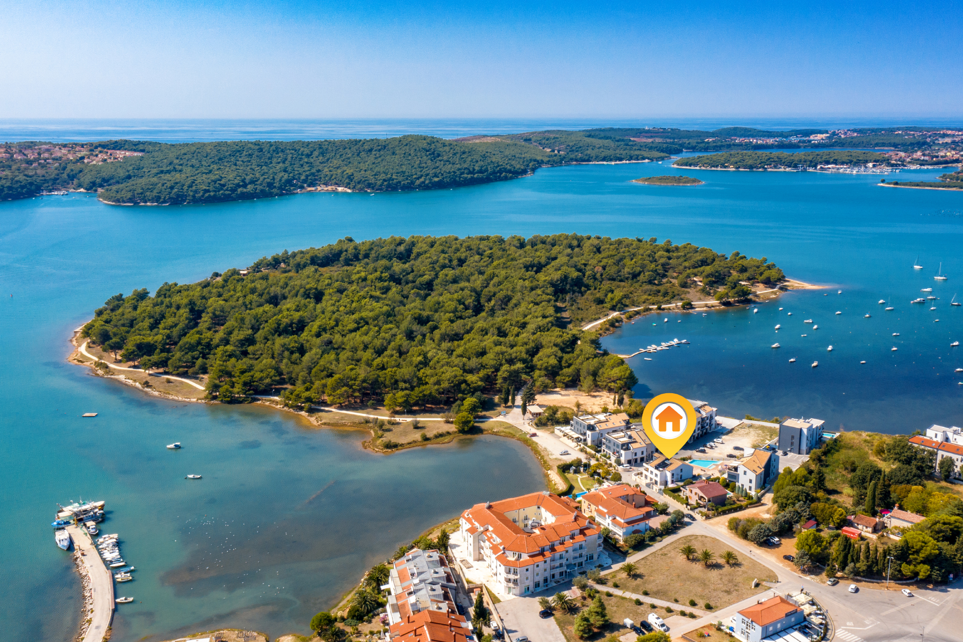 Die Lage, direkt an der Halbinsel Vizula, bietet einen herrlichen Meerblick. Zu den wilden Stränden auf Vizula haben Sie ca. 300 Meter, 5 Minuten zu Fuß. Der Sandstrand liegt ca. 800 Meter entfernt – an der Hafenpromenade entlang ist man in ca. 10 Minuten zu Fuß dort.