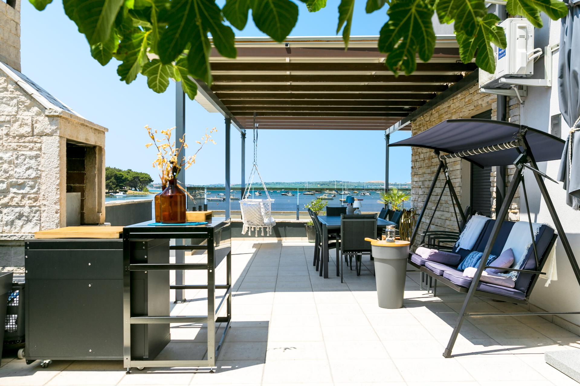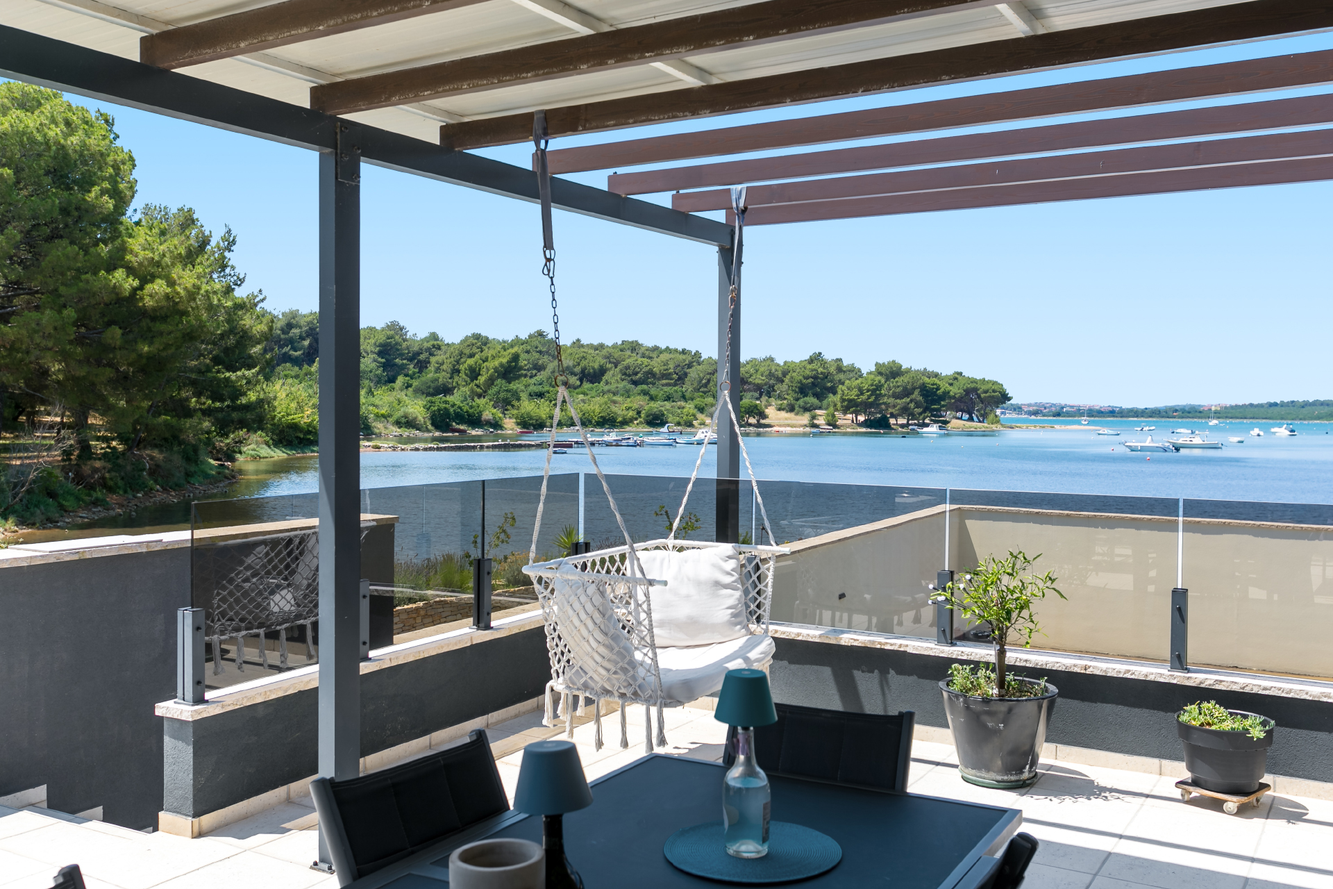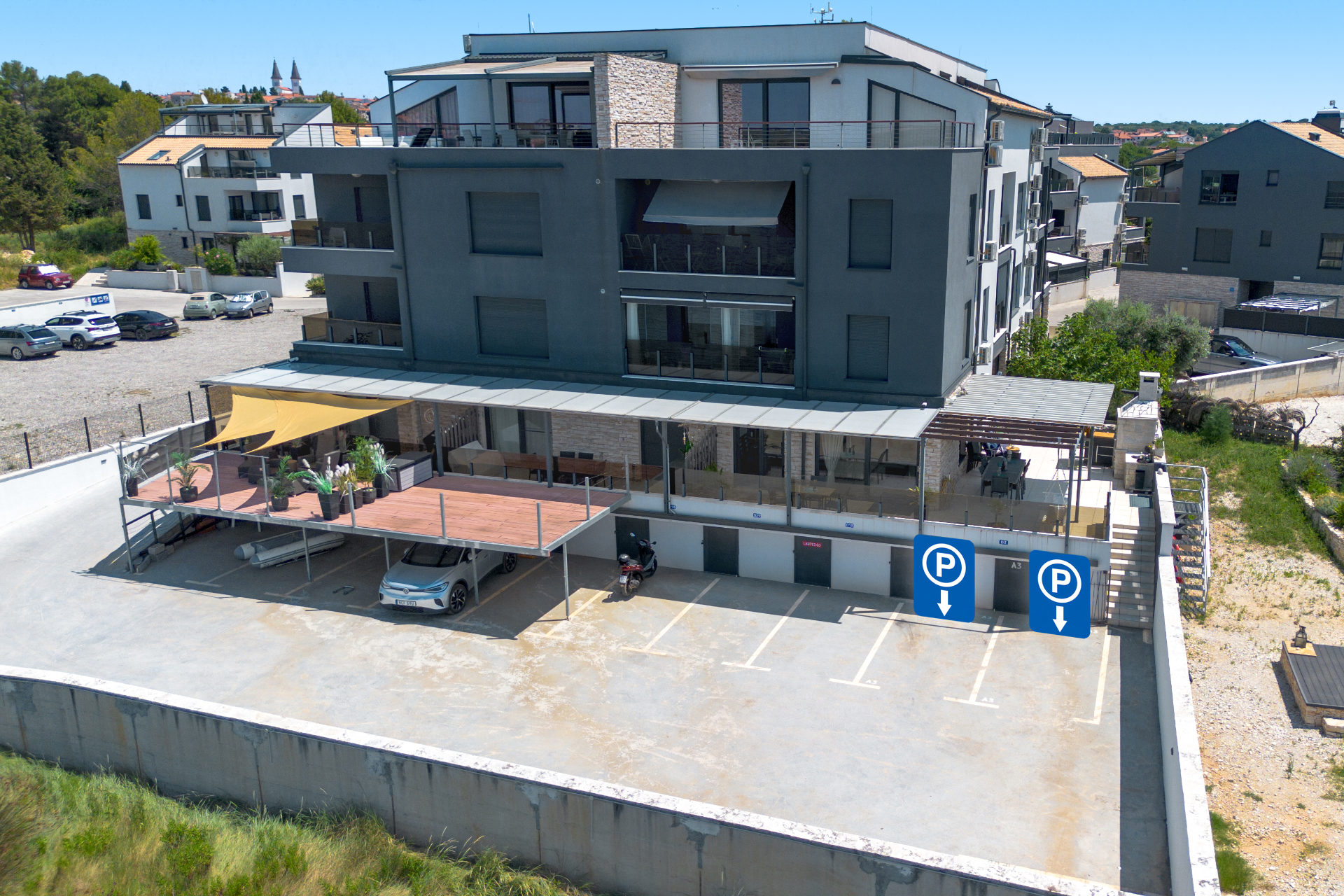 Diese behindertengerecht ausgestattete, 80 qm große TOP-Ferienwohnung im Erdgeschoss liegt in Medulin im Neubau-Areal „Vizula Sunset“ Teil D am Fuße der Halbinsel Vizula und bietet nicht nur einen Pool – sondern auch einen gigantisch schönen Meerblick von der 80 qm großen Terrasse in Richtung Bucht Vizula. Die Terrasse ist mit einem Olivenbaum sowie mehreren mediterranen Gewürzen bepflanzt.